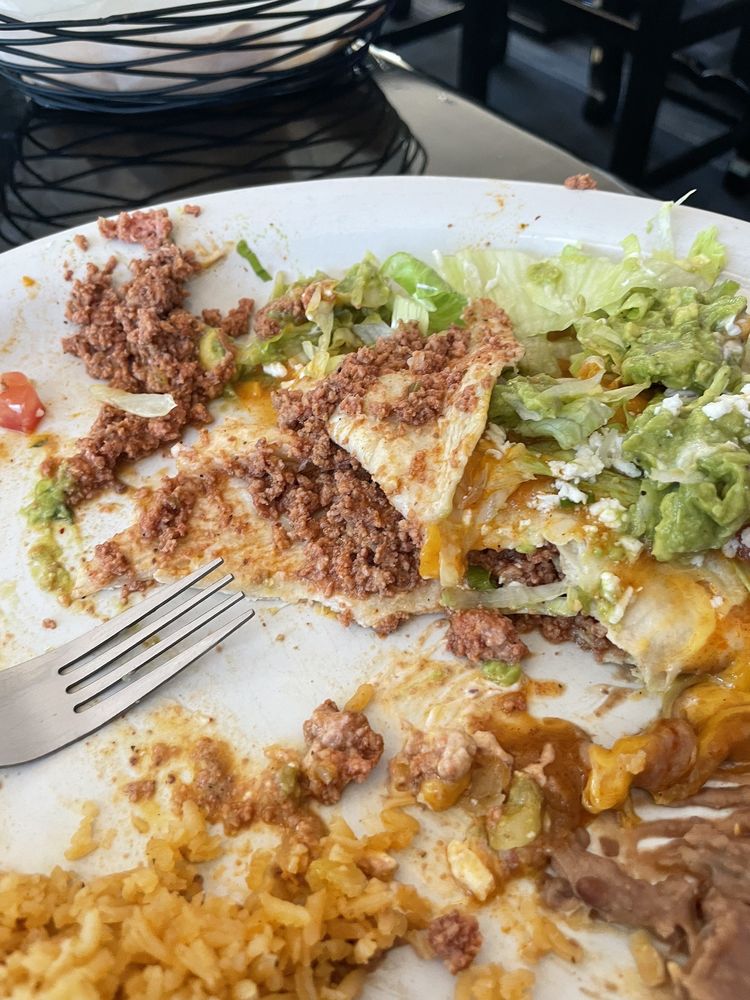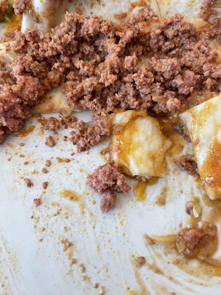 Chiken, ground beef, or shredded beef, rice and beans inside only.