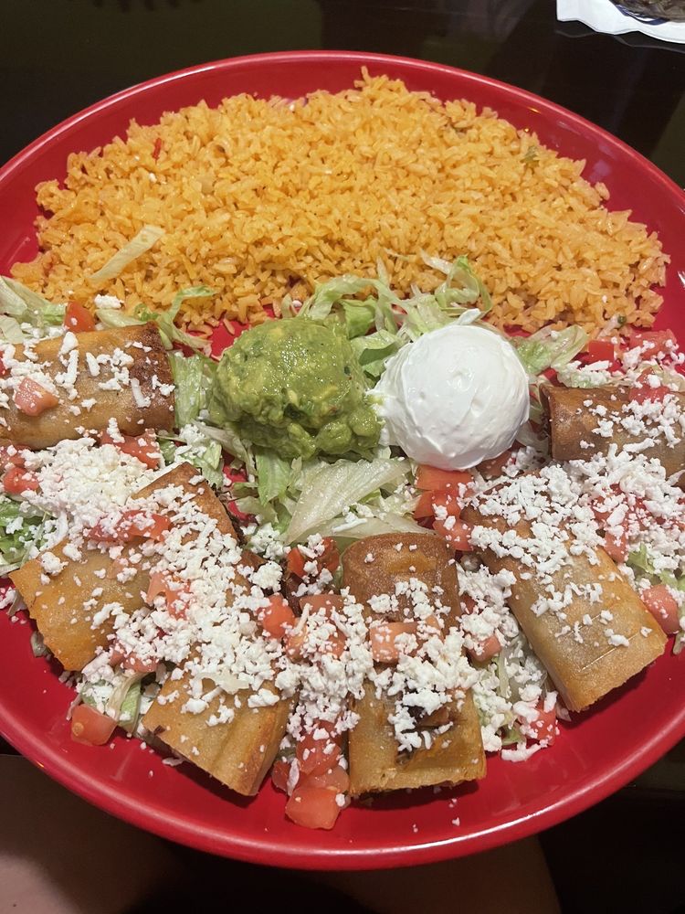 Crispy flour tortillas filled with chicken, rolled and fried. Served with guacamole, sour cream, tomatoes and lettuce.